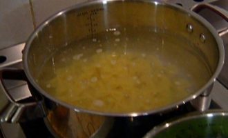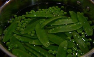 Горошек и фасоль отваривать в кипящей воде несколько минут, затем воду слить.
