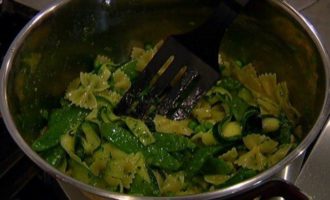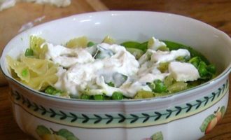 К готовым макаронам добавить горошек, фасоль и цукини, заправить соусом и перемешать.