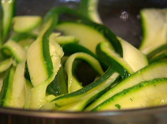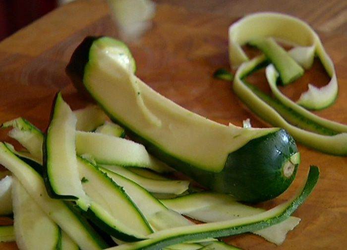 Цукини вместе с кожурой нарезать тонкими длинными полосками (можно воспользоваться овощечисткой).
