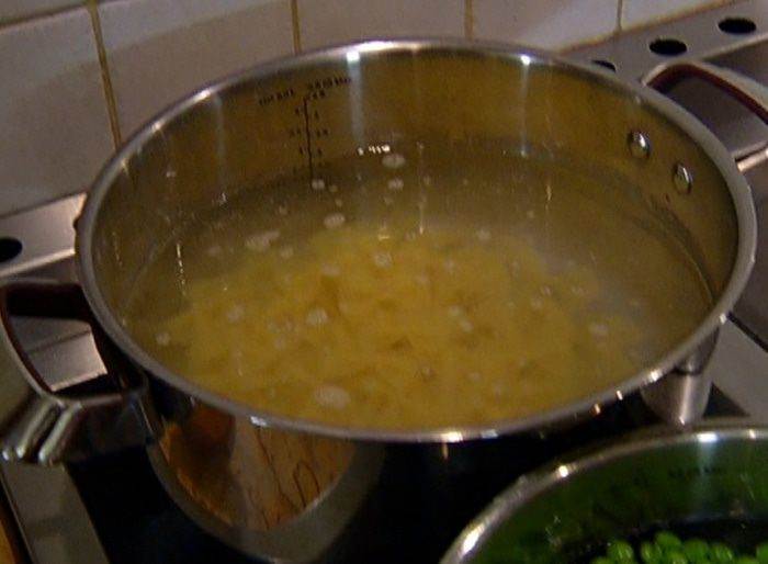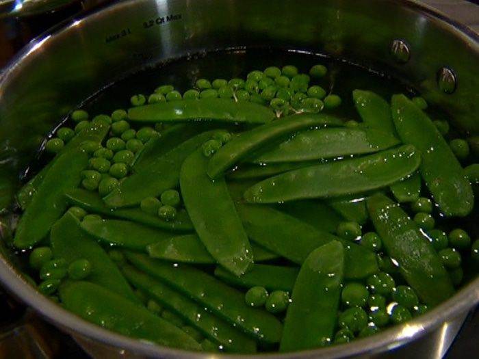 Горошек и фасоль отваривать в кипящей воде несколько минут, затем воду слить.