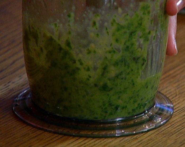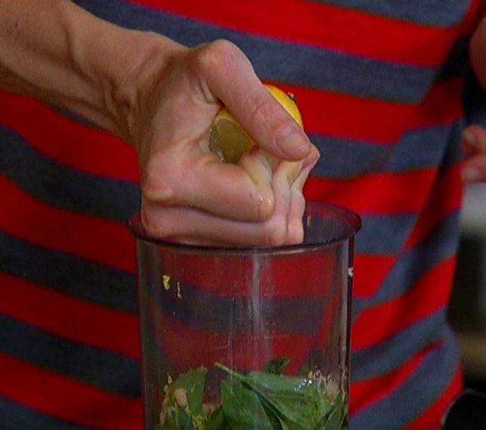 Базилик, лимонную цедру, сахар и орехи поместить в блендер, добавить щепотку соли, лимонный сок и 2-3 ст. ложки оливкового масла и все взбить.