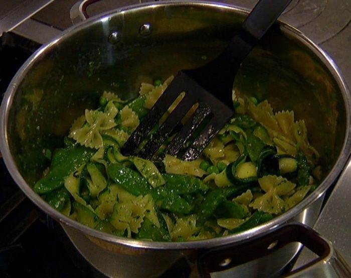 Разогреть в сковороде 1 ст. ложку оливкового масла, выложить цукини, посолить и слегка обжарить.