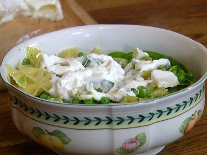 К готовым макаронам добавить горошек, фасоль и цукини, заправить соусом и перемешать.