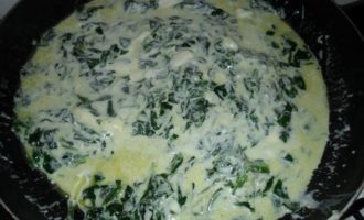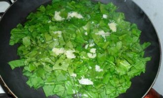 • Ставим воду на пасту, пусть закипает. А мы тем временем на разогретую сковороду выкладываем шпинат, добавляем немного воды, оливковое масло и выдавливаем чеснок. Накрываем крышкой и тушим 7-9 минут пока не выпарится вода.