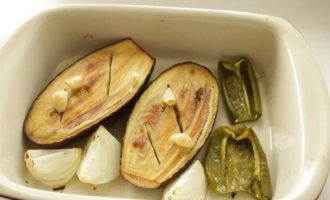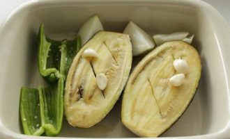 Лук почистить и порезать на дольки. Сладкий перец очистить и порезать на части. Смазать кусочки лука, перца и чеснок оливковым маслом со всех сторон и положить рядом с баклажаном.