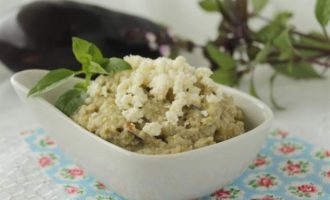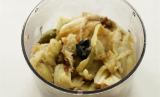 • Вынуть мякоть из баклажана и положить в чашу комбайна. Добавить лук, перец и чеснок. Добавить лимонный сок, 1 ст.л. оливкового масла, соль и перец по вкусу.