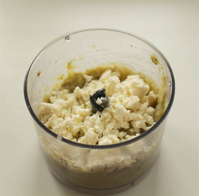 • Добавить (3/4) раскрошенной феты, оставив ~1/4 на посыпку. Нажать на «пульс» еще 1-2 раза до небольших кусочков.