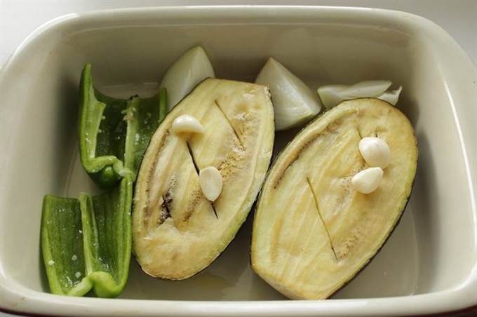 Лук почистить и порезать на дольки. Сладкий перец очистить и порезать на части. Смазать кусочки лука, перца и чеснок оливковым маслом со всех сторон и положить рядом с баклажаном.