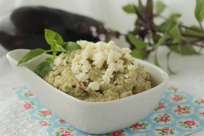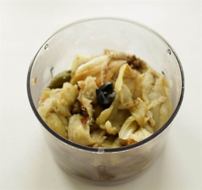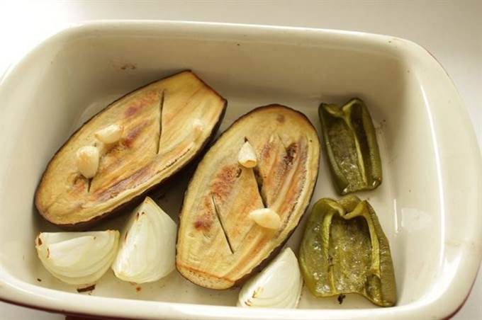 • Вынуть мякоть из баклажана и положить в чашу комбайна. Добавить лук, перец и чеснок. Добавить лимонный сок, 1 ст.л. оливкового масла, соль и перец по вкусу.