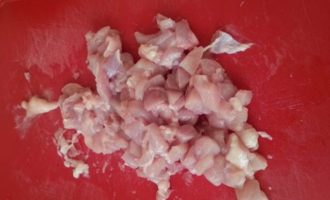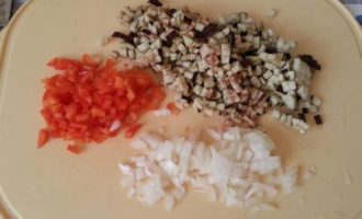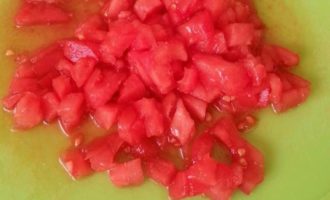 Помидор надрезаем и ошпариваем, убираем шкурку и мелко режем…