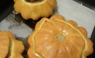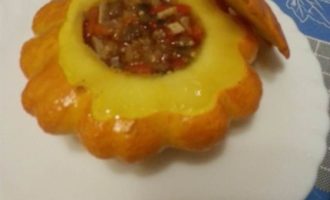 На небольшом количестве растительного масла обжариваем сначала лук, добавляем мясо, затем перец и баклажан. Затем помидор и чеснок, солим и перчим по вкусу. Начинку выкладываем в патиссоны и накрываем крышкой…