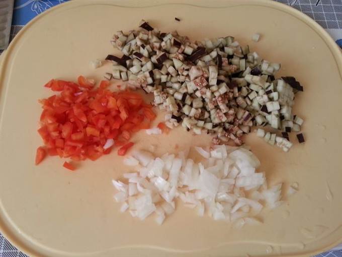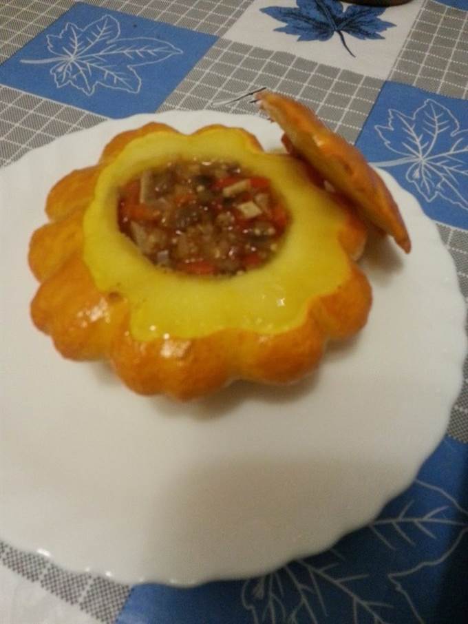 На небольшом количестве растительного масла обжариваем сначала лук, добавляем мясо, затем перец и баклажан. Затем помидор и чеснок, солим и перчим по вкусу. Начинку выкладываем в патиссоны и накрываем крышкой…