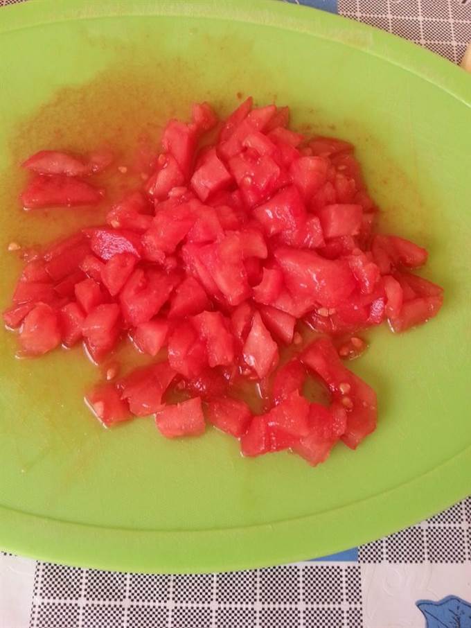 Помидор надрезаем и ошпариваем, убираем шкурку и мелко режем…