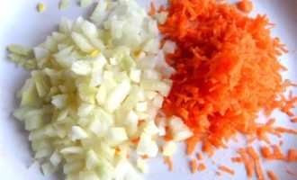 Луковицу измельчить, морковку натереть мелко.