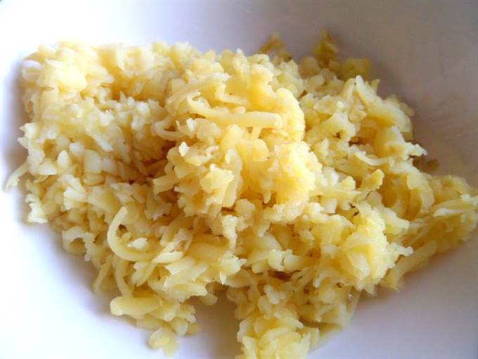 Отварной картофель натереть на крупной терке.