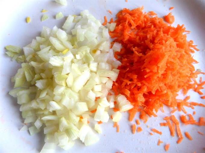 Луковицу измельчить, морковку натереть мелко.