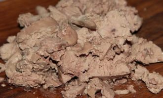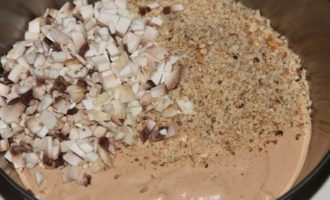 • Выкладываем массу в глубокую миску. Шампиньоны нарезаем мелко, орехи смалываем на кофемолке и добавляем к сырно-печеночной массе все орехи и половину грибов. Хорошенько вымешиваем. Нарезаем пучок укропа и добавляем в полученную массу. Если вас устраивает консистенция чиза, вторую половину грибов можно и не добавлять. Я добавила и вторую половину вместе с укропом — получилось в самый раз.