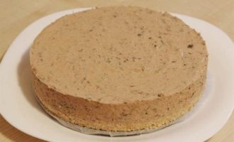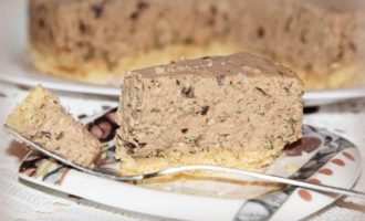 • Перекладываем массу на корж в разъемную форму, затягиваем все пленкой и отправляем в холодильник. Достаточно 4 часов, но у меня все выдерживалось до утра.