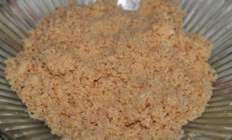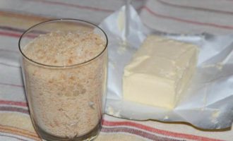 • Отвариваем печень и оставляем остужаться. Берем стакан сухарей и сливочное масло. Я взяла 50 грамм, можно взять больше, если хотите чтобы основа совсем не крошилась. У меня она держалась в куче, но немного крошилась.