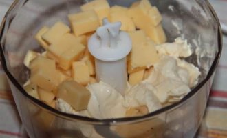 • В чашу блендера отправляем мягкий сыр, нарезанный кубиком сыр Гауда и сметану.