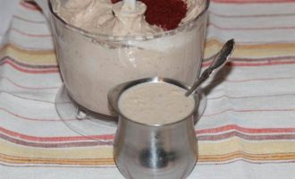 • В теплой воде замачиваем быстрорастворимый желатин, ставим на медленный огонь и, постоянно помешивая, растворяем желатин полностью. Не доводите до кипения! Только хорошо прогреть. В чашу блендера к сырной массе добавляем печень и пробиваем блендером. Затем берем две столовые ложки смеси, добавляем к желатину и помешиваем до получения однородности. В чашу блендера добавляем паприку.