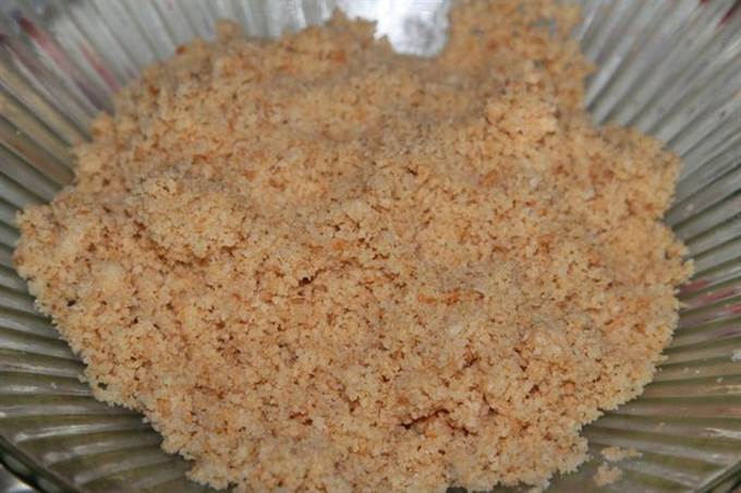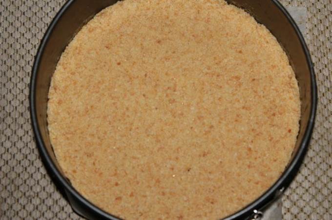 • Дно разъемной формы выстилаем пергаментом, выкладываем сухари и плотно трамбуем.
