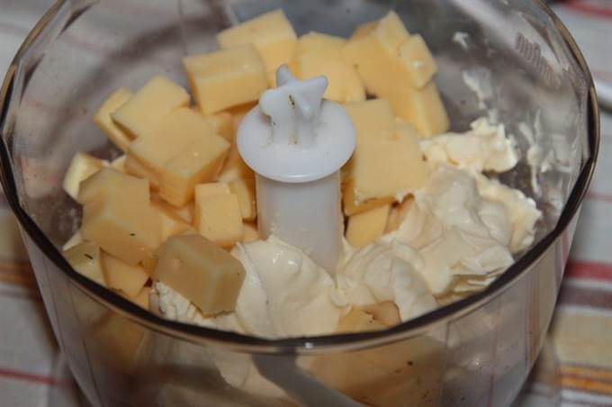 • В чашу блендера отправляем мягкий сыр, нарезанный кубиком сыр Гауда и сметану.
