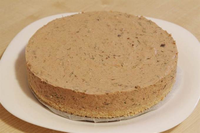 • Перекладываем массу на корж в разъемную форму, затягиваем все пленкой и отправляем в холодильник. Достаточно 4 часов, но у меня все выдерживалось до утра.