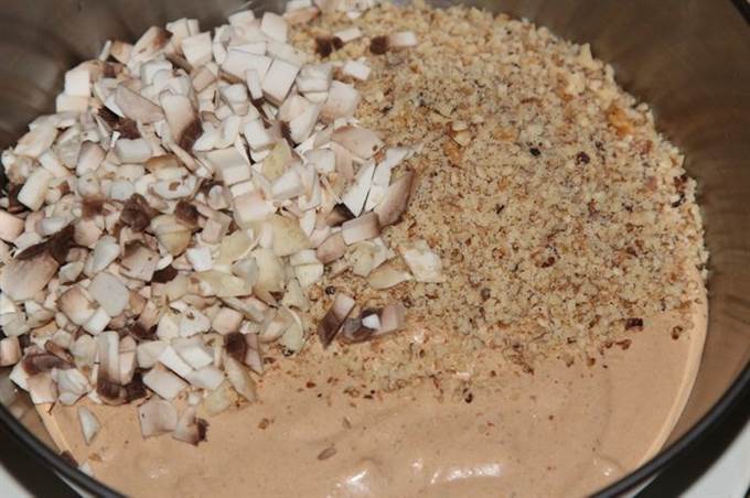 • Выкладываем массу в глубокую миску. Шампиньоны нарезаем мелко, орехи смалываем на кофемолке и добавляем к сырно-печеночной массе все орехи и половину грибов. Хорошенько вымешиваем. Нарезаем пучок укропа и добавляем в полученную массу. Если вас устраивает консистенция чиза, вторую половину грибов можно и не добавлять. Я добавила и вторую половину вместе с укропом — получилось в самый раз.