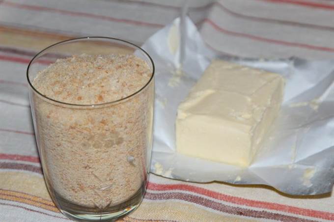 • Отвариваем печень и оставляем остужаться. Берем стакан сухарей и сливочное масло. Я взяла 50 грамм, можно взять больше, если хотите чтобы основа совсем не крошилась. У меня она держалась в куче, но немного крошилась.