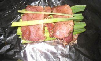 Порезать мясо на стейки. Добавить соль, лавровый лист и сухую аджику. Хорошо перемешать и оставить 30 мин мариноваться. Взять фольгу, выложить лепесток порея, сверху мясо и так несколько слоев.