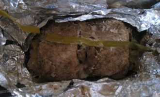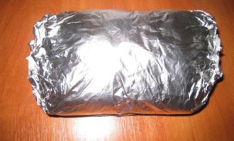 Плотно завернуть в два слоя фольги, положить в жаропрочную емкость.
