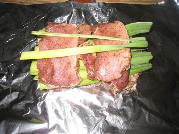 Порезать мясо на стейки. Добавить соль, лавровый лист и сухую аджику. Хорошо перемешать и оставить 30 мин мариноваться. Взять фольгу, выложить лепесток порея, сверху мясо и так несколько слоев.