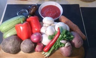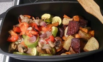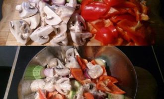 Нарезаем толстенькими шайбами кабачки, перец — крупными дольками, грибы на 4 части, лук на 4 части, сбрызгиваем оливковым маслом, присыпаем крупной морской солью, молотым перцем и прованскими травами.