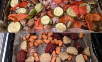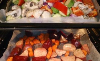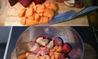 Нарезаем крупно картофель, морковь, свеклу, сбрызгиваем оливковым маслом, присыпаем крупной морской солью, молотым перцем и прованскими травами.