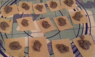 Раскатываем кусочек теста в пласт, режем его на квадраты (у меня размером около 5 см с каждой стороны). На каждый квадратик выкладываем по 1 чайной ложке начинки.
