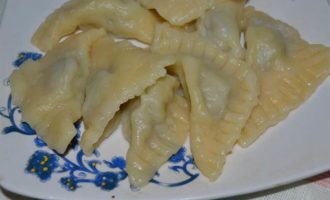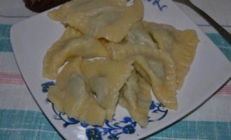 Залепляем пельмени треугольником, по краю для крепости и резного рисунка прижимаем дополнительно вилкой.