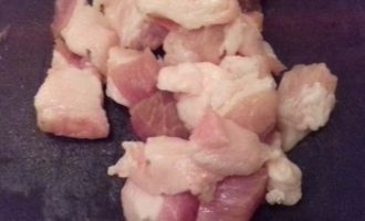 Чтобы фарш получился более рассольным, добавляем к рыбе свиное сало (можно чтобы было немного мяса). Режем его на небольшие кусочки и тоже пропускаем через мясорубку.