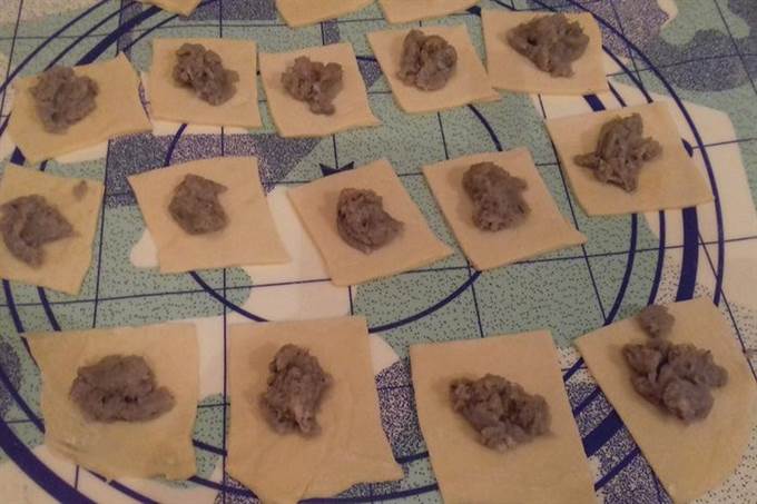 Раскатываем кусочек теста в пласт, режем его на квадраты (у меня размером около 5 см с каждой стороны). На каждый квадратик выкладываем по 1 чайной ложке начинки.