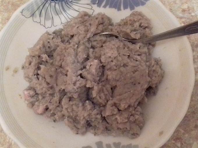 Смешиваем рыбу и сало, добавляем по вкусу соль, специи (я использую специальные «для рыбы»). Пюрируем фарш блендером.