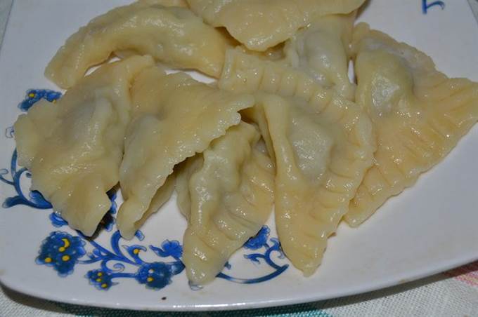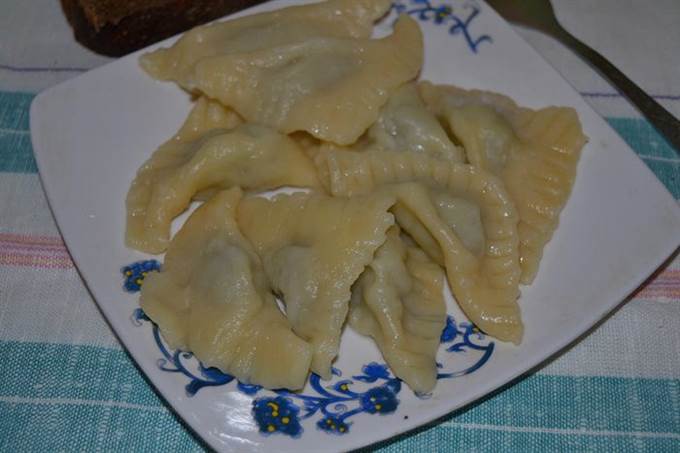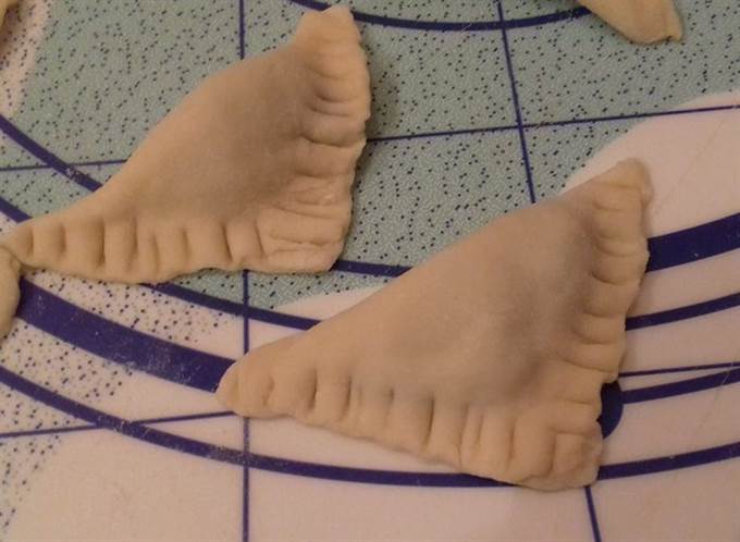 Залепляем пельмени треугольником, по краю для крепости и резного рисунка прижимаем дополнительно вилкой.