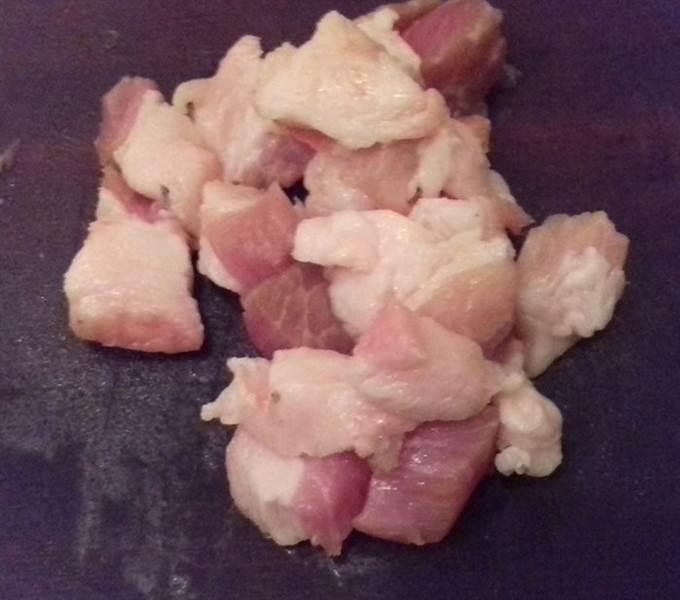 Чтобы фарш получился более рассольным, добавляем к рыбе свиное сало (можно чтобы было немного мяса). Режем его на небольшие кусочки и тоже пропускаем через мясорубку.