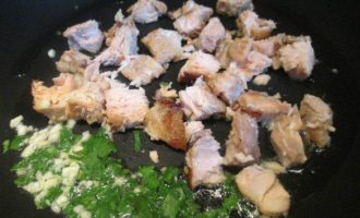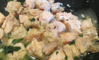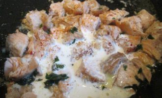 • В кипящую подсоленную воду кладем пенне и отвариваем 10 минут до состояния аль денте. А пока варятся макароны, готовим лосося: нарезаем его мелкими кусочками и обжариваем на оливковом масле, добавляем измельченный чеснок, петрушку, соль.