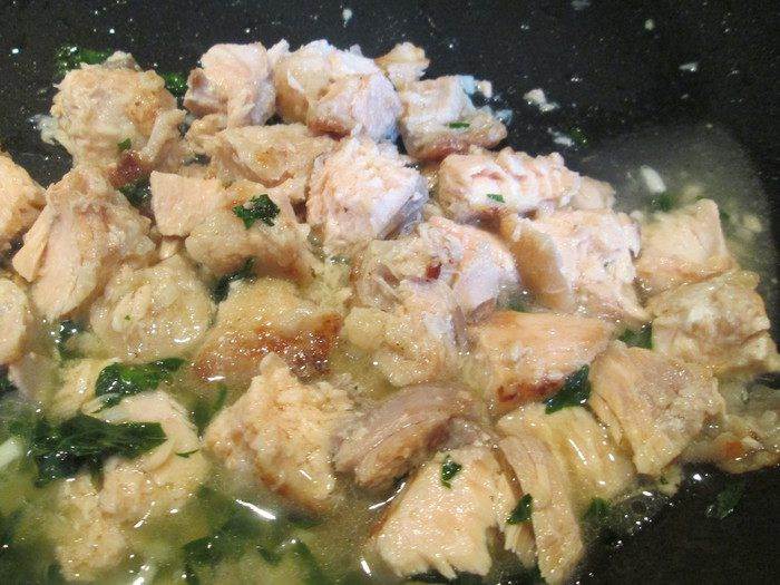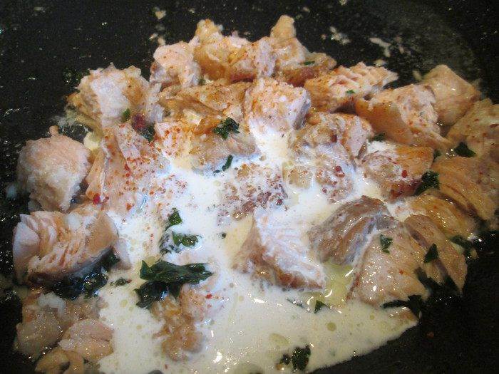 • В кипящую подсоленную воду кладем пенне и отвариваем 10 минут до состояния аль денте. А пока варятся макароны, готовим лосося: нарезаем его мелкими кусочками и обжариваем на оливковом масле, добавляем измельченный чеснок, петрушку, соль.