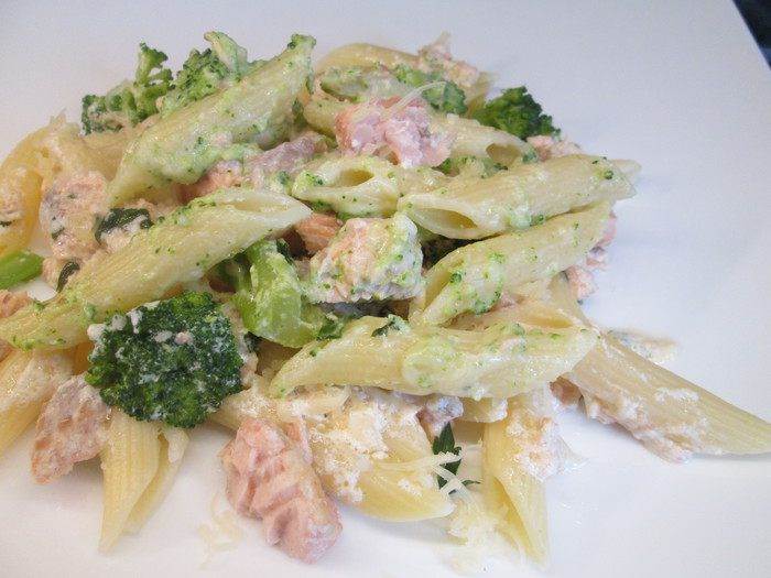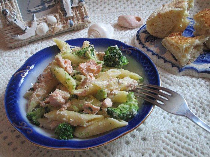 Пенне ригате с лососем и брокколи под сливочным соусом