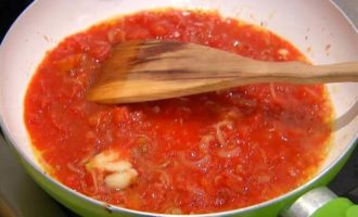 Приготовить соус: разогреть в сковороде оставшееся оливковое масло и обжарить лук и чеснок, затем добавить помидоры в собственном соку, чили, черный перец и соль, все перемешать и прогреть.