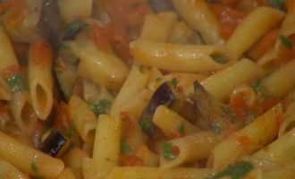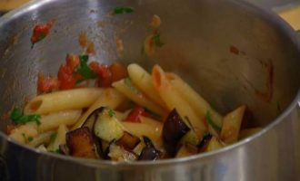 Горячие макароны перемешать с теплым соусом и измельченной петрушкой, затем добавить обжаренные баклажаны и еще раз перемешать.