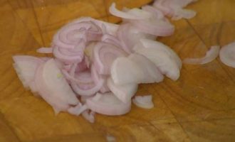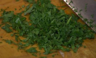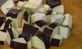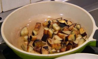 Разогреть в сковороде 2 ст. ложки оливкового масла и обжарить нарезанный баклажан до золотистого цвета, затем добавить чили, черный перец и соль, все перемешать.
