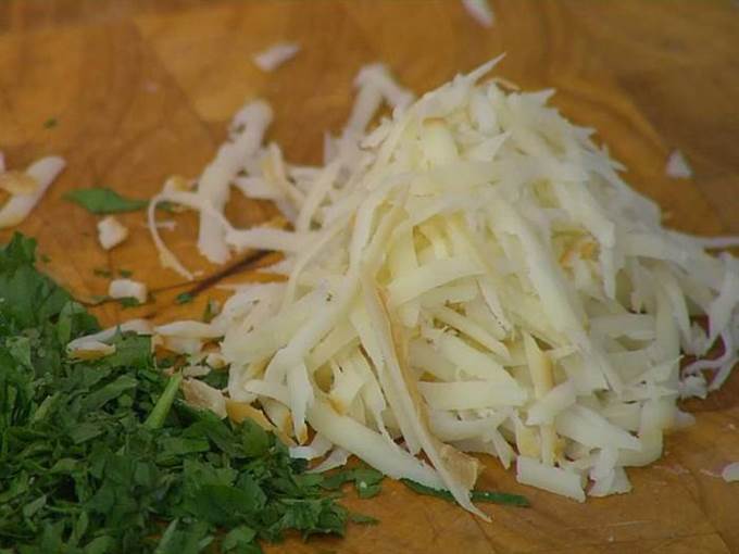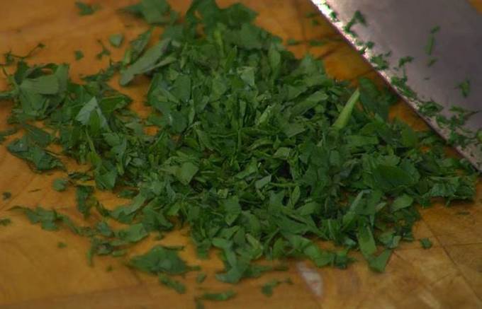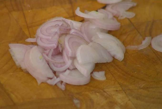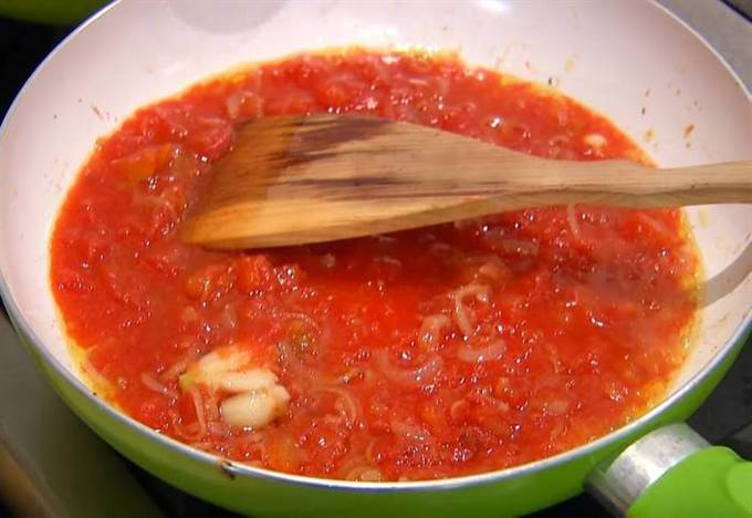 Приготовить соус: разогреть в сковороде оставшееся оливковое масло и обжарить лук и чеснок, затем добавить помидоры в собственном соку, чили, черный перец и соль, все перемешать и прогреть.
