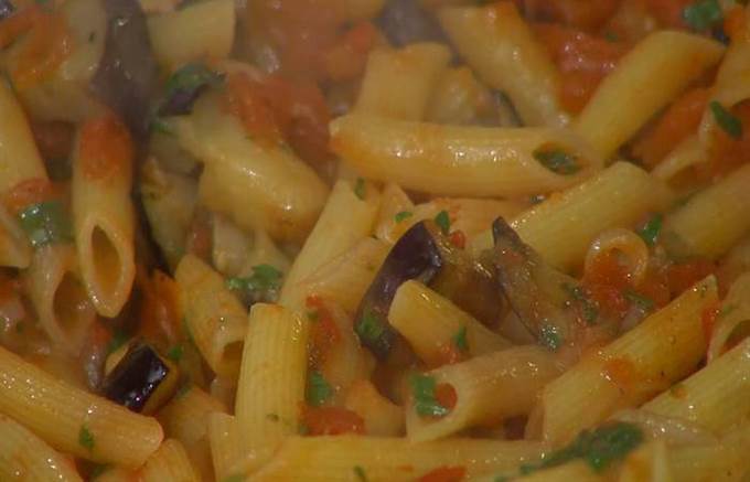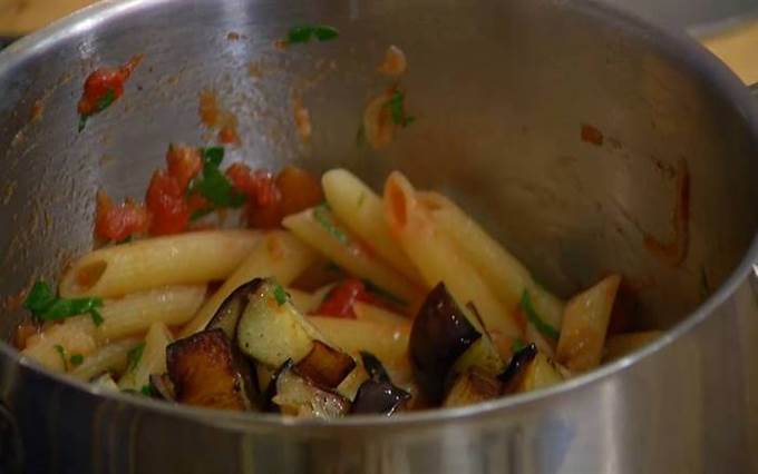 Горячие макароны перемешать с теплым соусом и измельченной петрушкой, затем добавить обжаренные баклажаны и еще раз перемешать.